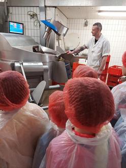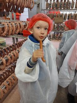 Wir wollten schon immer einmal erfahren, wie die Wurst, die es im Geschäft zu kaufen gibt, hergestellt wird. Voller Neugier starteten wir unseren Besuch im Aufenthaltsraum der fleißigen Mitarbeiter und wurden mit Haube und Mantel wie kleine Helfer ausgestattet. Aufgeregt sind wir Herrn Arnold und Frau Philipp in die Produktionsstätten gefolgt. So groß haben wir uns das gar nicht vorgestellt. Wir haben erfahren, wo die Ware angeliefert wird und wo die Schweinehälften gelagert werden, um sie später zu verarbeiten und durften jeden Schritt genau beobachten und den Arbeitern über die Schulter schauen. So durften wir zuschauen wie das Fleisch gewolft wird, Gewürze dazukommen und wie die Wurst dann in den Darm gepresst wird. Wir sind durch die unterschiedlichen Kammern gegangen, wo die Wurst reifen muss, geräuchert wird und wo sie letztendlich für die Auslieferung bereitgestellt wird. Unterwegs konnten wir erleben und erfahren wie Sülze gemacht wird vom Zerkleinern des Fleisches bis zur fest gepressten Sülzwurst. Viele Kinder haben ihre Lieblingswurst entdeckt wie Salami, Leberwurst, Teewurst, Leberkäse u.v.m. Heute war Salamitag und so erfuhren wir das es 33 Stunden braucht, bis die Wurst fertig zum Verzehr ist.