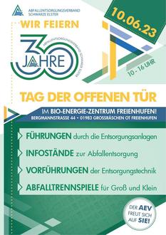 Der Abfallentsorgungsverband Schwarze Elster wird in diesem Jahr 30 Jahre alt. Anlässlich des Jubiläums lädt der AEV interessierte Bürgerinnen und Bürger am Samstag, 10. Juni 2023, zum Tag der offenen Tür ins Bio-Energie-Zentrum nach Freienhufen ein.