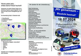 Zu unserem diesjährigen direktionsweiten Tag der offenen Tür der Polizei. Am 16.07.24 von 09:30 Uhr bis 15:00 Uhr in Senftenberg, Rudolf-Breitscheid-Straße 14. Wir arbeiten Hand in Hand mit der Feuerwehr, dem Katastrophenschutz, dem Rettungswesen und dem technischen Hilfswerk. Daher unser Motto „Wir gemeinsam-Blaulicht hautnah“. Wir bieten euch ein vielfältiges Programm, für Jung und Alt. Veranstaltungsbereiche sind hier das Polizeigelände, das Pegasus und der Stadthafen. Seid hautnah dabei, macht einfach mit!