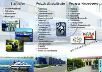 Am Stadthafen fühlt sich die Wasserschutzpolizei in ihrem Element. Vorführungen gibt es hier gemeinsam mit der Wasserwacht auf dem Senftenberger See. Die Polizeitaucher sowie die Pferde der Bundespolizei sind hier ebenfalls postiert. Die Reiter auf hohem Ross begeben sich zwischendurch auf einem Ausritt zum Polizeigelände in die Rudolf-Breitscheid-Straße.