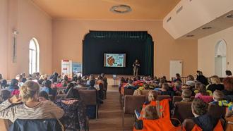 Insgesamt 108 Kinder, deren Erzieherinnen und Erzieher sowie Lehrerinnen waren erschienen und folgten aufmerksam der Geschichte um das kleine Eichhörnchenmädchen Emilie, welches plötzlich an einer Nussallergie erkrankt und fortan wachsam und mit einem kleinen Notfallrucksack „bewaffnet“ ihr Leben bestreiten muss. Ein zauberhaftes Buch, welches, der Autor Henning Kreitel seiner kleinen Tochter widmet. Es thematisiert kindgerecht das immer häufiger auftretende Phänomen der Allergien. Auch einige der Kinder im Saal haben bereits Erfahrungen mit Allergien gemacht, konnte der Autor im Austausch mit den Kindern erfahren. Im Anschluss an die Lesung vermittelte ein Film über Eichhörnchen zahlreiche interessante Informationen und niedliche Impressionen von den kleinen, flinken Nagetieren. Und im abschließenden Quiz bewiesen die Kinder, dass Sie aufmerksam zugehört haben und bereits über Vorwissen zu Eichhörnchen verfügen. Autor Henning Kreitel und wir, das Team der Stadtbibliothek, sind ganz begeistert über die Aufmerksamkeit, mit der die Kinder der Veranstaltung folgten.