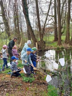 Mit den Becherlupen wurden die kleinen Käfer, Libellenlarven und Muscheln genau beobachtet, dann ins Aquarium gesetzt und später mit dem Wasser in den Teich zurückgegeben. Frösche sprangen im Wasser herum und Schmetterlinge tummelten sich in der Morgensonne. Die Sonne brachte das Wasser zum Glitzern. Die Vögel zwitscherten um uns herum. Ein wunderschöner Frühlingstag. Beim gemeinsamen Abschlussspiel fingen die „Frösche“ die „Fliegen“ und hungrig und voller Eindrücke ging es zum Mittag zurück in die Kita. Ein großes Dankeschön möchten wir an Susann und Leonie weitergeben, die uns kindgerecht und voller Entdeckerdrang mit auf diese schöne Tour genommen haben. Die Kinder haben ihren Eltern schon beim Abholen von den Erlebnissen am Teich berichtet. Wir freuen uns schon auf die nächste Tour.
