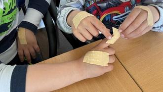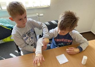 Die Bastelmäuse bekamen gezeigt, wie man kleine Wunden mit Pflastern versorgt und einen einfachen Verband anlegt. Das war interressant! Natürlich lernten die Kinder auch, wo und wie man „Hilfe“ bekommt. Für den Ernstfall kennen bereits viele Kinder die richtige Notfallnummer.