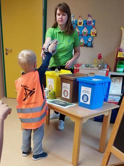Die Neugier und das Interesse der Vorschulgruppe war riesig. Mit großen Augen staunten die Kinder als die verschiedenen Wertstofftonnen in Miniausgabe ausgepackt wurden. So kamen eine gelbe Tonne (für Verpackungsmaterialien), eine blaue Tonne (Papier und Pappe), eine schwarze Tonne (Restabfall) und eine braune Tonne (Bioabfall) zum Vorschein. Zu Beginn schlüpften alle Kinder erstmal in die orangefarbenen Westen für kleine „Abfallinspektoren.“ Den Kindern wurde auf eine sehr kindgerechte ansprechende Art und Weise die Mülltrennung erklärt und es war erstaunlich, wie gut sie sich schon damit auskannten. Die Mitarbeiter des AEV hatten viel „Müll“ dabei, den die Kinder den richtigen Tonnen zuordnen mussten und jeder konnte zeigen, was er schon weiß bzw. dazugelernt hat. Die Kinder hatten viel Freude beim Sortieren der verschiedenen haushaltstypischen Dinge wie alte Zahnbürsten, Schuhe, Jogurtbecher, Bananenschalen, Blumentöpfe, altes Spielzeug, Eierpappen, Zeitungen u.v.m.