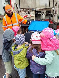 Sie erfuhren sehr anschaulich, wie die Mülltonnen geleert und deren Inhalte weiter verwertet werden. Sie hörten, dass Strom und Wärme erzeugt werden können, Kompost zu nährreicher Erde umgewandelt wird, indem er von Würmern und Bakterien zersetzt wird und wie die fertige Erde riecht und sich anfühlt. Die Kinder lernten die verschiedenen Altglasbehälter kennen und ordneten verschiedenes Altglas zu.