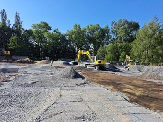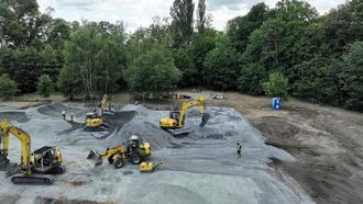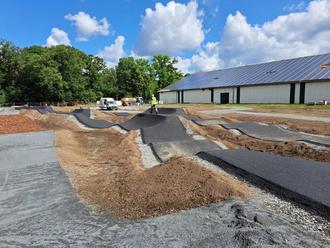 In ähnlicher Größenordnung wurden über 2000 Tonnen Schottertragschicht auf einer Fläche von rd. 2000 m² wieder eingebaut um die notwendige Stabilität für den zukünftigen Parcours des Pumptracks sowie auch des Kidstracks sichern zu können. Damit begann dann aber auch schon die Arbeit der Profis für den Bau dieser Sportanlage. Mit dem Anlegen der Hügel und Senken sowie den entsprechenden Kurvenradien wurde der Grundstein für eine zukünftige unfallfreie Fahrt über den Pumptrack gelegt.