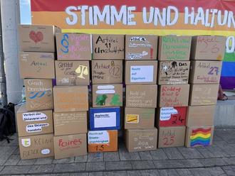Demokratie gemeinsam gestalten, diesen Gedanken setzten die 8.Klasse des Elsterschlossgymnasiums Elsterwerda und ihre Lehrerin Frau Steinhäuser gemeinsam kreativ um, indem sie den Demokratieturm aus Pappkartons mit den 30 Menschenrechten bunt kreierten.