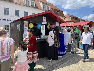 Für die kleinen Gäste gab es eine Hüpfburg, Spielstationen, Bastelstände und einen Graffiti Workshop des Cottbuser Künstlers Martin Jainz (Kunst mit Herz). Bei der Jugendfeuerwehr Elsterwerda konnten die Kids ihre Geschicklichkeit ausprobieren. Auch kulinarisch war das Fest ein Genuss: an den reich geschmückten Ständen gab es traditionelle Spezialitäten aus Afghanistan, Syrien, Palästina, Ukraine, Afrika, die die Frauen mit viel Liebe und Herz präsentierten, und die kulturelle Vielfalt der Stadt widerspiegelten.