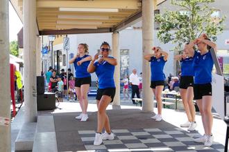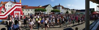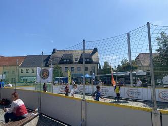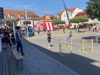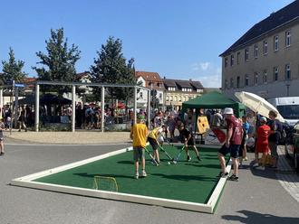 Der Marktplatz erschloss sich als ein enormes Angebot unserer städtischen Vereine. So konnte man sich ausprobieren beim Hockeyspielen, Handball, die Riesenrutsche des Wochenkurier austesten, die Welt des Ausdauertrainings und Radsports erkunden, sich der Abenteuerfreude bei Kuroi Tora und besonderer Kampfsportarten widmen, mit dem TSC Sportensemble das Rhönrad ausprobieren.