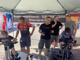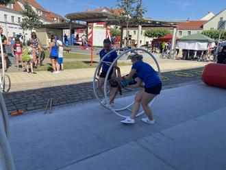 Auch der Hundesport repräsentierte seine verantwortungsvolle Tätigkeit und hatte einen liebevollen und geduldigen Vierbeiner als Vertreter dabei. Die Freiwillige Feuerwehr präsentierte die große Drehleiter und stellte ihre Aufgaben und Angebote eindrucksvoll dar. Auch die Polizei hatte für Radfahrer ein herausforderndes Sicherheitstraining vorbereitet. Mit dem großen Surfsimulator von der EnviaM war ein außergewöhnlich spannendes Angebot der Sportvereine auf dem Markt präsent.