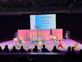 Wir reisten gemeinsam als Verein mit 38 Aktiven an, um diese Veranstaltung mit erleben zu können. Mit unserer Darbietung „Save the Paradies“, welche inhaltlich die Verschmutzung der Meere aufgreift und die Schönheit der Unterwasserwelt und Korallenriffe darstellen soll, haben wir am Bundesfinale der Tuju-Stars teilgenommen. Insgesamt starteten 22 Vereine, welche sich bereits für den Vorentscheid qualifiziert hatten - wie auch wir. Als absolutes Highlight haben wir es geschafft, die Jury mit unserer Show zu überzeugen und sind in das Finale mit weiteren sieben Gruppen auf Bundesebene eingezogen. Völlig überwältig waren wir Teil einer beeindruckenden Abendveranstaltung und ein kleiner Traum von uns wurde wahr. Letztendlich belegten wir den vierten Platz im Bundesfinale und konnten das Land Brandenburg innerhalb Deutschlands gebührend vertreten. Wir sind unglaublich stolz auf diese Leistung, so haben sich die letzten Wochen intensiven Trainings ausgezahlt.