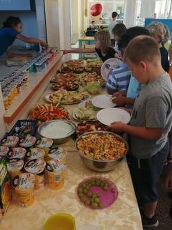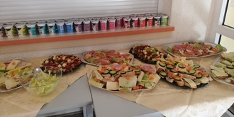 Vorher haben sich die Fünftklässler gut überlegt, was auf dem Speiseplan stehen sollte. Obst- und Gemüsespieße, eine Gemüseplatte, leckere Schnittchen, kleine Würstchen und vieles mehr wurden den jüngsten Kindern unserer Schule serviert. Für jeden Geschmack war etwas dabei.