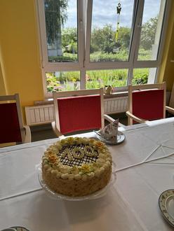 Die Feierlichkeiten wurden von einer wunderschönen Torte und Sekt begleitet, und es war ein berührender Moment, als alle gemeinsam auf das lange Leben von Frau Weinhold anstießen.