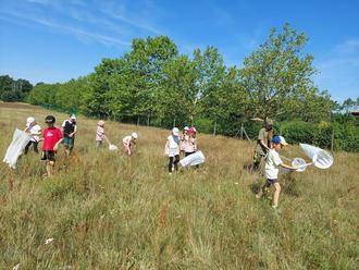 Mit Keschern und Becherlupen machten sich die Kinder dann selbst auf die Suche nach den Tieren auf der Wiese.