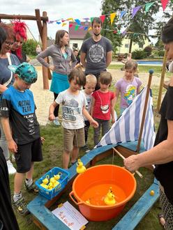 „Sport frei“ für alle Kinder, Eltern und Großeltern war das Motto unseres Familienfestes in diesem Jahr. Bei einem kleinen Warmup zeigten die Kinder u.a. beim Theosong ihre Geschicklichkeit und ihren Gleichgewichtssinn. Jedes Kind erhielt eine Stempelkarte und so konnte die ganze Familie an verschiedenen Aktionsständen wie beim Teebeutelweitwurf, Entenangeln, beim Sommerskifahren, beim Bienenbällezielwurf, beim Hobbyhorsing und beim Kegeln auf einer großen Bahn wetteifern und ihre Sportlichkeit zeigen. Alle Familien nahmen mit Freude an den kleinen Wettkämpfen teil und konnten so ihre Stempelkarten gefüllt abgeben. Wurden alle Aufgaben mit Bravour gelöst, konnten die Kinder im Sandkasten nach einem Ü-Ei graben und am gut gefüllten Preisstand etwas aussuchen. Für Abwechslung und gute Laune stand auch eine Hüpfburg bereit, wobei wir uns ganz herzlich bei Frau Drümmer und beim Skoda Autohaus in Elsterwerda für die Bereitstellung bedanken möchten.