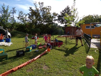 Ein weiterer Höhepunkt war der Besuch vom Spielmobil. Eine große Bewegungs- und Wasserbaustelle wollte erkundet und ausprobiert werden. Dabei waren die Kinder kreativ, ausdauernd und mehr als begeistert.