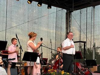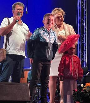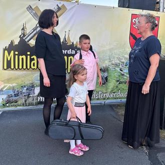 Die Überraschungsstars des Abends - Charlotte Tellisch (4 Jahre) und Nicholas Tellisch (9 Jahre) aus Bad Liebenwerda. Beide spielen bei der Kreismusikschule Gebrüder Graun auf der Geige und versetzten die Gäste des Classic Open Airs mit ihrem musikalischen Können ins Staunen. Auf dem Foto sind sie mit Ihrer Mutti und der Orgaleiterin des Orchesters zu sehen.