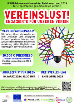 Die LEADER-Region Zwickauer Land startet am 08. Januar 2024 ihren neuen Ideenwettbewerb für eingetragene gemeinnützige Vereine aus dem Zwickauer Land. Unter dem Motto „Vereinslust – Engagierte für unseren Verein“ werden noch nicht umgesetzte Ideen gesucht, durch die Vereine engagierte Personen gewinnen können, entweder durch neuen jungen oder auch erfahrenen Nachwuchs, durch Aktivierung stiller Mitglieder oder durch Nachfolge in der Vorstandsarbeit.