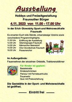 Viele Fraureuther Bürger und Vereine haben eine interessante Ausstellung zusammengestellt und wir würden uns über eine rege Beteiligung und den Besuch von Euch sehr freuen. Lasst Euch überraschen, welche Aktivitäten im Ort stattfinden. Vielleicht finden sich neue Interessengruppen zu einer gemeinsamen Freizeitgestaltung zusammen.