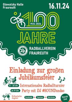Am 16.11.2024 findet unsere große Jubiläumsveranstaltung 100 Jahre RVE statt. Ab 13:00 Uhr beginnt ein internationales Radballturnier der Spitzenklasse. Wir begrüßen u.a. Mannschaften der 1. und 2. Bundesliga Deutschland, den tschechischen Meister, sowie den WM-Teilnehmer der Slowakei. Der Eintritt ist frei. Nach dem offiziellen Teil gegen 17 Uhr, findet am Abend nach dem spannenden Finale eine öffentliche Veranstaltung mit Disco, Cocktails, Essen und Getränken in der EGLO Halle Fraureuth statt. Dazu sind Alle auf das Herzlichste eingeladen!