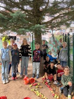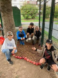Bei strahlendem Herbstwetter hat die Klasse 3a ihren Hortalltag in die Natur verlegt. Ganz spontan kamen die Kinder selbst auf die Idee, mit Eicheln, Äpfeln und Tannenzapfen etwas zu gestalten. Ohne Anleitung, einfach aus Freude am Tun, entstand so der Plan, ein gemeinsames Naturprojekt zu erschaffen. Drei Tage lang arbeiteten die Kinder mit Begeisterung daran. Es wurde gesammelt, ausprobiert und immer wieder gemeinsam überlegt, wie es weitergehen könnte. Dabei war eine wunderbare Gruppendynamik zu spüren – alle halfen einander, sprachen sich ab und hatten viel Spaß am gemeinsamen Gestalten. Am Ende entstand ein tolles Ergebnis, auf das die ganze Klasse stolz war. Und das Schönste daran: Die Augen der Kinder haben vor Freude und Stolz richtig geleuchtet.