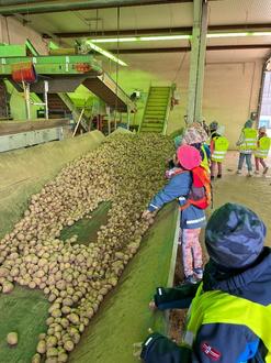 Ein weiterer toller ABC Ausflug führte uns zum Agrarhof in Gospersgrün. Hier durften wir ganz viel über die Arbeit unserer Landwirte erfahren. Außerdem waren wir dem Getreide und den Kartoffeln auf der Spur. In den großen Getreidesilos konnten wir Berge voll Getreide nicht nur sehen, sondern auch anfassen. Das unser Frühstücksmüsli aus diesen Körnern bestehen soll, konnten sich einige erst mal nicht so richtig vorstellen, aber Frau Kahnes zeigte uns, dass man sie auch schälen und quetschen kann. Und siehe da, das Innere des Haferkorns schmeckte doch tatsächlich wie die uns bekannten Haferflocken. Wir durften auch unser Wissen bei den anderen verschiedenen Getreidesorten testen und schnitten gut ab dank Teamwork. Besonders spannend war es bei den Kartoffeln. Wir durften nämlich den Arbeitern über die Schultern gucken. Die Kartoffeln kamen gerade mit dem Traktor hineingefahren und ab aufs Förderband zum Sortieren und in die Säcke packen.