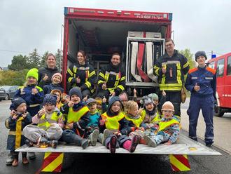 Ein super spannendes Highlight war unser Besuch bei der freiwilligen Feuerwehr in Beiersdorf. Keiner ist zu klein zum Helfen! Aber Helfen will gelernt sein! Die Kameraden und Kameradinnen schenkten uns ihre Zeit und zeigten uns wie das die Profis machen. Wir verbrachten einen spannenden Vormittag mit Feuerwehrautos, jede Menge technischer Geräte, Feuerwehrausrüstung und einer ersten Hilfe Auffrischung im Gerätehaus mit Verbänden und bunten Pflastern. Besonders stolz waren wir Erzieherinnen auf unsere ehemaligen, nun schon großen Glücksbärchen Charlotte, Palina und Johann, die als Kinder- und Jugendfeuerwehr-mitglieder uns tatkräftig unterstützt haben.