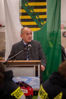 Ortswehrleiter von Fraureuth Patrick Päsler begrüßt die Gäste in seiner Rede