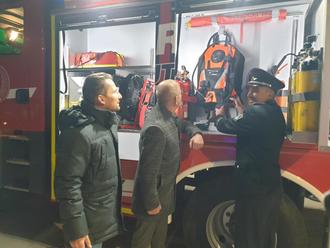 Wehrleiter Päsler erläutert dem Bürgermeister und dem Hauptamtsleiter Details am neuen Fahrzeug