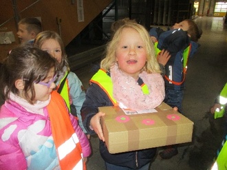 Gemeinsam machten wir uns auf den Weg zum Postfrachtzentrum. Unterwegs sahen wir noch Rehe über das Feld rennen. Im Frachtzentrum angekommen wurden wir von Frau Kuhnert und einer Mitarbeiterin herzlich begrüßt. Da wir alle schon unsere tollen Westen anhatten, bekamen unsere Erzieher noch tolle Westen. Frau Kuhnert hatte für beide Einrichtungen Päckchen gepackt, die wir dann auf die Reise schickten, ihren Weg beobachteten und letztendlich auch wieder in der richtigen Station wiederfanden.