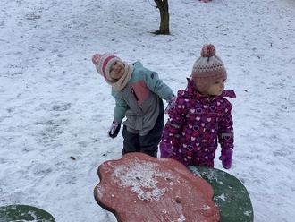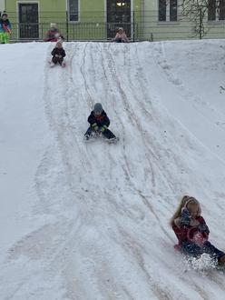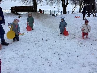Wir stapften Spuren in den Schnee, machten Schneeengel, halfen dem Hausmeister beim Schippen, bauten Schneemänner und Kugelbahnen. Es gab natürlich auch die eine oder andere Schneeballschlacht und auf unserem kleinen Hügel im Kindergarten jede Menge Rodelspaß - auch schon für unsere Jüngsten. Bei den älteren Kindern war die Rodelbahn im Park sehr beliebt und es wurden die verschiedensten Rodelgeräte darauf getestet.