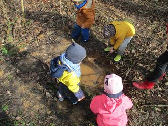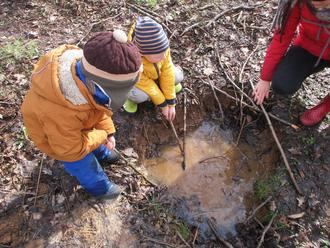 Auf dem Weg in den Wald lauschen wir dem Wind in der alten Fabrik (schaurig aber schön), dem Gesang der Vögel und sehen ganz viele Frühlingsboten. Wir „angeln“ im gut gefüllten Bach, balancieren und klettern auf Bäume. Besonders lustig ist es durch die großen Pfützen auf dem Weg zu hüpfen. Matschig aber glücklich geht es zum Mittagessen zurück in den Kindergarten. Das war toll! Wir freuen uns schon aufs nächste mal.