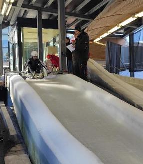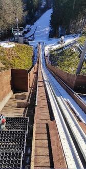 Am Sonntag fuhren wir dann zur Sportstättenwanderung nach Oberhof, nur 20 km entfernt. Nach einführenden Worten über den schon über 100 Jahre existierenden Wintersport im Ort ging es zur Wadeberg - Schanze mit Blick zur Eis - Arena und den Fallbachhang. Am Zieleinlauf der Rennrodelbahn ging es dann nun immer bergauf. Es lief gerade ein Trainingslauf der Jugend.