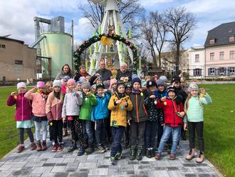 Das Schmücken der Bäume und Sträucher für den Ostermarkt am Herrenhaus ist jedes Jahr wieder ein besonderes Erlebnis für die Kinder. Dieses Jahr beteiligten sich die Hortkinder der Klassen 2a, 2b und 3b daran. Fleißig bemalten sie Ostereier mit verschiedensten Motiven und hängten sie einige Tage vor Beginn des Ostermarktes dort auf. Der Bürgermeister Herr Topitsch und Herr Jakob, der alles sehr liebevoll vorbereitete, begrüßten uns an der Osterpyramide. Eifrig hängten die Kinder die Ostereier auf und bestaunten die schöne Osterdekoration - die Pyramide, das Hasenhaus, die Osterhasen sowie die großen Osternester. Herr Jakob verteilte im Anschluss für alle noch eine kleine Überraschung. Bevor wir den Heimweg antraten, legten wir noch einen Zwischenstopp bei der Eisdiele von Frau Schubert ein, um ein Eis zu genießen. Dies war ein toller Abschluss unseres Ausfluges.