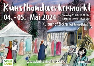 Der Kulturhof Zickra bei Berga/Elster (Ostthüringen) lädt wieder im Mai zum traditionellen Kunsthandwerkermarkt ein. Die über 60 Aussteller aus ganz Deutschland präsentieren ihr kunsthandwerkliches Können. Dazu gibt es kulturelle Darbietungen für Jung und Alt.