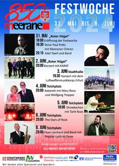 Vom 31. Mai bis 9. Juni 2024 feiert die Stadt Meerane ihr 850-jähriges Stadtjubiläum! Auf die Meeranerinnen, Meeraner und alle Gäste wartet eine Festwoche voller musikalischer, kultureller, sportlicher und kulinarischer Highlights und einem Programm, bei welchem für jede Altersgruppe und jeden Geschmack etwas dabei sein dürfte.