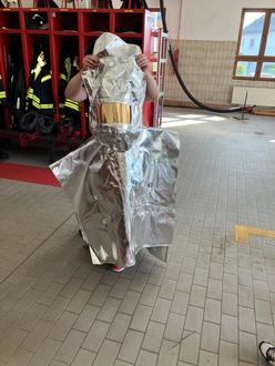 Für die Kinder war es sehr spannend, all das, was sie bereits aus Büchern kennen, einmal live zu sehen und ausprobieren zu können. Neben den Feuerwehrautos konnten wir sämtliche Ausrüstungen von früher und heute anschauen und auch anprobieren. Die Feuerwehrleute erklärten den Kindern ganz genau, wie man einen Notruf richtig absetzt und auf was dabei geachtet werden muss. Im Anschluss daran durften wir uns darin erproben, einen Notfall zu melden.