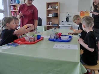 Ein besonders anspruchsvolles Highlight hatten sich unsere „ABC-Mäuse“ im Vorfeld ausgewählt. Im Workshop „Wasser – immer nur nass?“ wurden in unterschiedlichsten Experimenten die ungewöhnlichen Eigenschaften dieses Elements erforscht, zum Beispiel: „Wie geht Licht durch Wasser?“ oder „Wie viele Tropfen passen auf eine Münze?“. Im Anschluss daran hatten unsere kleinen Forscher großen Hunger, daher trafen wir uns zu einem leckeren Mittagessen im Aufenthaltsraum des Hauses.