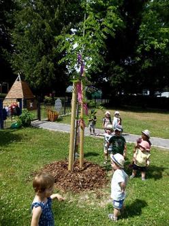 Außerdem sponserte uns Herr Henry Brandt eine wunderschöne Robinie, die er auch gleich mittels Technik fachgerecht in unseren Garten einsetzte. Vielen Dank auch dafür! Wir gießen fleißig, damit er gut gedeiht und uns in einigen Jahren Schatten spendet.