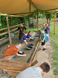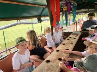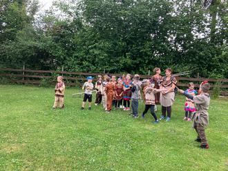 Doch damit nicht genug. Am 02.07.2024 wurde die „Glühwürmchengruppe“ gleich nach dem Frühstück von einem Bus zu einem spannenden und abenteuerlichen Ausflug ins „Indianercamp Silberstraße“ abgeholt. Die Kinder waren als kleine Indianer verkleidet und der Busfahrer wurde gleich beim Einsteigen in den Bus mit einem Indianergruß begrüßt. Im Camp angekommen, durften sich die Kinder, wie es sich für richtige Indianer gehört, einen für sie passenden Namen wie z. B. „weiße Feder“, „starker Bär“ oder „goldene Sonne“ heraussuchen. Nach der Namenstaufe wurde die Gruppe in ein großes Tipi geführt und dort konnten die Kinder viel Interessantes über das Leben der Indianer erfahren. Nach der Theorie kam die Praxis. Die Kinder wurden kreativ und bastelten Kopfschmuck, stellten kleine Medizinbeutel her, übten sich im Pferderennen, konnten Gold waschen und mit dem Bogen schießen. Jeder schöne Tag geht mal zu Ende und als die Gruppe am Nachmittag den Heimweg antrat, fühlten sich die Kinder wie echte kleine Indianer und strahlten über das ganze Gesicht. Dadurch konnten sich die Erzieherinnen sicher sein, dass den Kindern dieser Tag sehr gefallen hat und sie noch lange von den tollen Erlebnissen erzählen werden.