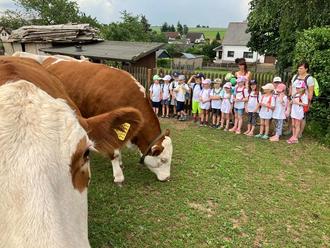 Kaum war die Festwoche der Kita „Regenbogen“ vorbei, konnten die ABC-Kinder sich auf weitere Höhepunkte freuen. Bevor die Vorschulkinder sich am 27.06.2024 auf den Weg zur Pension Jakob machten, stärkten sie sich bei einem gemeinsamen, gesunden und leckeren Frühstück. Die Kinder waren alle sehr aufgeregt und bei der Wanderung zur Pension konnten sie ihr Wissen über das Verhalten im Straßenverkehr auffrischen. Schon von weitem konnte man die Hühner gackern hören. Auf dem Bauernhof wurden die „Glühwürmchenkinder“ von der Familie Jakob begrüßt und herumgeführt. So ein Leben auf dem Bauernhof ist sehr interessant, denn es gibt wahnsinnig viel zu entdecken. Die Kühe „muhen“ auf der grünen Weide, die Hühner „gackern“ in ihrem Stall und die kleinen Babykatzen leben auf dem Heuboden.
