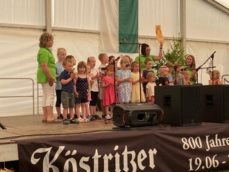 Und auch unsere Glücksbärchenkinder und Erzieherinnen durften sehr stolz ihren Teil zu diesem schönen Fest beitragen. Egal ob beim großen Auftritt mit unseren zum Großteil selbstgedichteten Liedern oder auf dem bunt geschmückten Traktoranhänger zum Umzug… Unsere Hoffnung… oder sagen wir das Versprechen: „Glücksbärchen Groß und Klein die Party die wird super sein!“ wurde mehr als erfüllt!