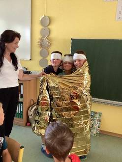 Dieses Jahr fingen unsere Sommerferien bereits am Donnerstag, den 20.06.2024 an. Das bedeutete für unsere Kinder zwei Tage mehr Urlaub. Die erste Ferienwoche lief unter dem Motto „SOS - Wir wissen uns zu helfen“. Hierbei hatten wir Unterstützung vom Jugendamt Zwickau, vertreten durch Frau Resch. Sie erklärte uns, was hinter den Hilfepunkten steckt und was passiert, wenn man sich dort Hilfe sucht. Damit wir alle in dieser Sache fit sind, haben wir natürlich alle diese Punkte in Fraureuth ausfindig gemacht. Passend zum Motto wurden alle Kinder vom DRK in der Ersten Hilfe unterrichtet und konnten am Ende selbst ihre Kuscheltiere versorgen.