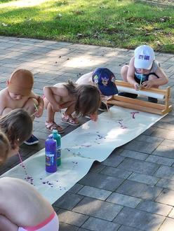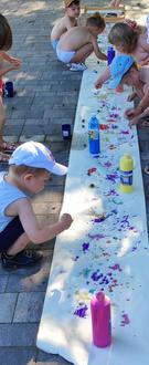 Bei schönstem sommerlichem Wetter, bot sich für die Kinder der Katzengruppe der Kita Kinderland das farbenfrohe „Malen mal anders“, im Freien an.