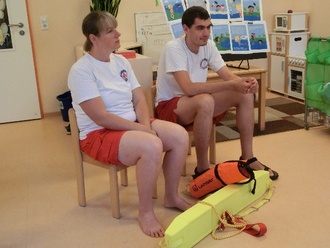 Anhand verschiedener Bildkarten erarbeiteten wir gemeinsam die unterschiedlichen Baderegeln. Verdeutlicht wurde dabei allen Vorschulkindern, wie wichtig das Einhalten dieser Vorsichtsmaßnahmen ist. Aber nicht nur theoretisch wurde die Wasserrettung besprochen.