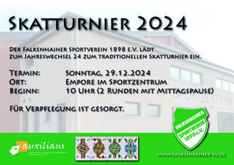 Der Falkenhainer SV lädt zum Skaten ein. Alle Mitglieder und Gäste treffen sich am 29.12.2024 zum Skaten im Sportzentrum. Es wird Preise, Pokale, Sachpreise und die rote Laterne zu gewinnen sein.