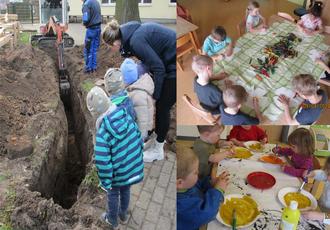 Ein großer Dank geht an der Stelle an Herrn Toni Graf! Damit unsere Matschanlage bald eingeweiht werden kann, hat Herr Graf angeboten, mit seinem Bagger ehrenamtlich die Wasserleitung frei zu graben und das Areal der Matschanlage für die kommende Sandlieferung vorzubereiten. Als unsere Kinder den Bagger entdeckten, war das Staunen groß. „Was macht der Bagger hier? Was für ein tiefes Loch! Wow!“