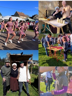 Wir hatten auch einiges zu bieten. Es war alles schön geschmückt, und durch die Leihgaben des Heimatmuseums in Großzschepa konnten wir mittelalterliche Gegenstände zu Schau stellen. Die Frauen im Ort hatten 10 Kuchen und zwei 2 Blechkuchen gebacken - innerhalb von 3 Stunden war alles „verputzt“. Die Kinder erfreuten sich mit den Erwachsenen mit den großen Holzspielen von unserer „Spielekönigin“ Steffi Braunsdort, beim Kinderschminken und Basteln, sowie an der super tollen Tanzeinlage der Powergirls aus Böhlitz. Auch Franziska konnte mit ihren Mittelalterkostümen zum Ausleihen und Fotografieren, Groß und Klein eine Freude machen. Überall war Gedränge und das Interesse groß.