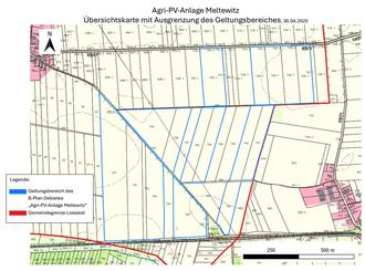 | 1. | Die Gemeindevertretung der Gemeinde Lossatal beschließt für den in der Anlage 1 dargestellten Geltungsbereich und die Flurstücke 730/1, 735/1, 738/1, 739/1, 740/1, 741, 742, 745, 746, 748, 749, 751, 752, 753, 754, 756, 759 sowie 758 (teilweise) in der Gemarkung Meltewitz die Aufstellung des vorzeitigen vorhabenbezogenen Bebauungsplans „Agri-PV-Anlage Meltewitz“. |