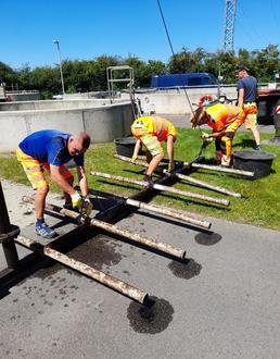 Das Hauptaugenmerk der Taucher lag auf dem Entfernen von Rechengut und Sandablagerungen im Belebungsbecken, die mit der Zeit den Mikroorganismen das Arbeiten erschweren. Um die organischen Bestandteile des Abwassers abzubauen, benötigen sie Sauerstoff, für deren Zufuhr Belüfterstränge am Boden des Belebungsbeckens sorgen. Durch die Ablagerungen wird dieser Prozess jedoch beeinträchtigt und kann nicht mehr optimal funktionieren, daher ist die Beräumung in regelmäßigen Abständen wichtig. Diese Arbeiten finden aller 4 Jahre parallel mit dem Tausch der Belüfterkerzen im Belebungsbecken statt.